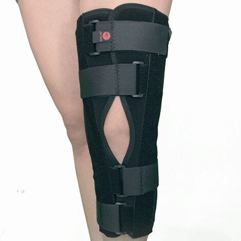 Órtesis elaborada en laminados acolchados, con cierres de contacto de alto agarre graduables que permiten el ajuste a la talla adecuada, con férulas laterales y posteriores que mantienen la extensión e inmoviliza la rodill